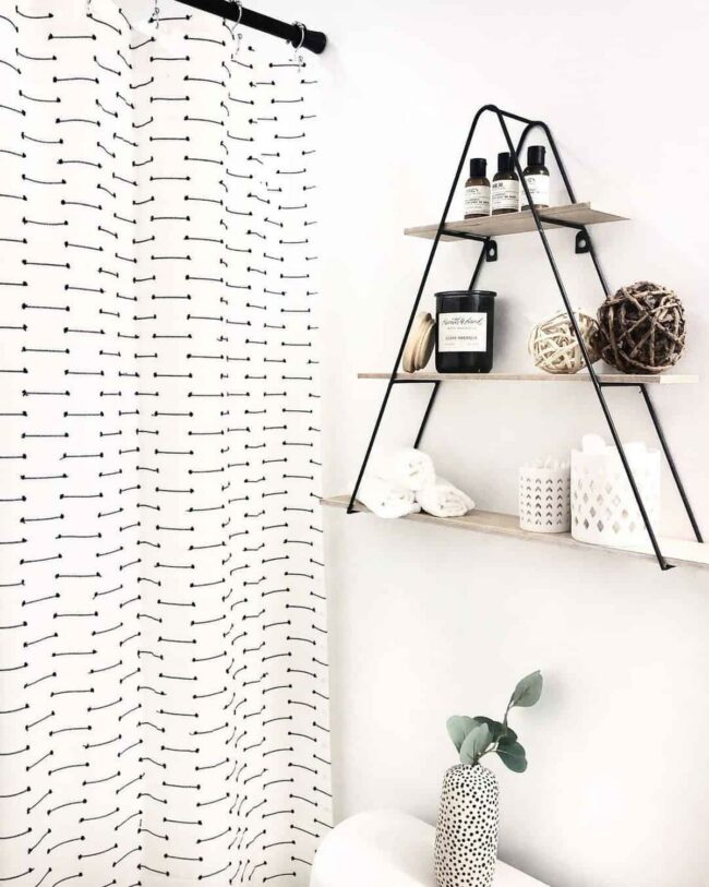 Black and white details echo through carefully selected accessories like the shower curtain, which pulls the entire aesthetic together.