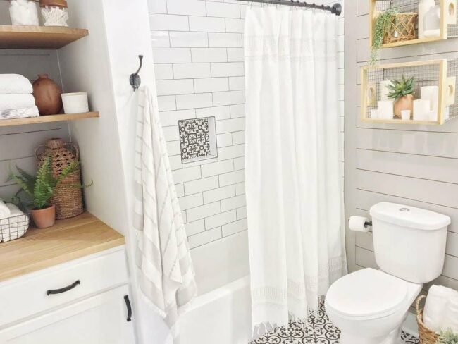 Plants bring natural magic to farmhouse bathrooms, instantly elevating the space with lush greenery against crisp white shiplap walls.