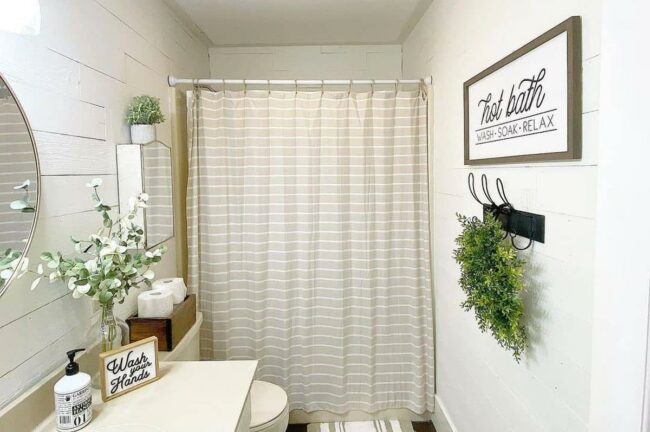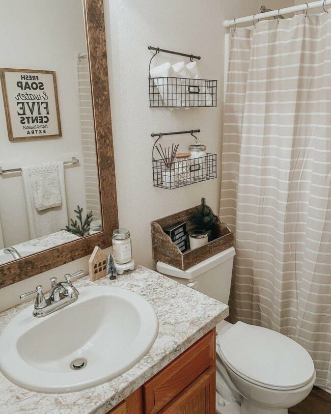 Neutral striped shower curtains complement the rustic aesthetic, creating a calm and welcoming environment.