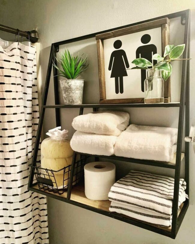 Black-framed shelves make a dramatic statement against beige walls, creating an instant focal point in this stylish bathroom.