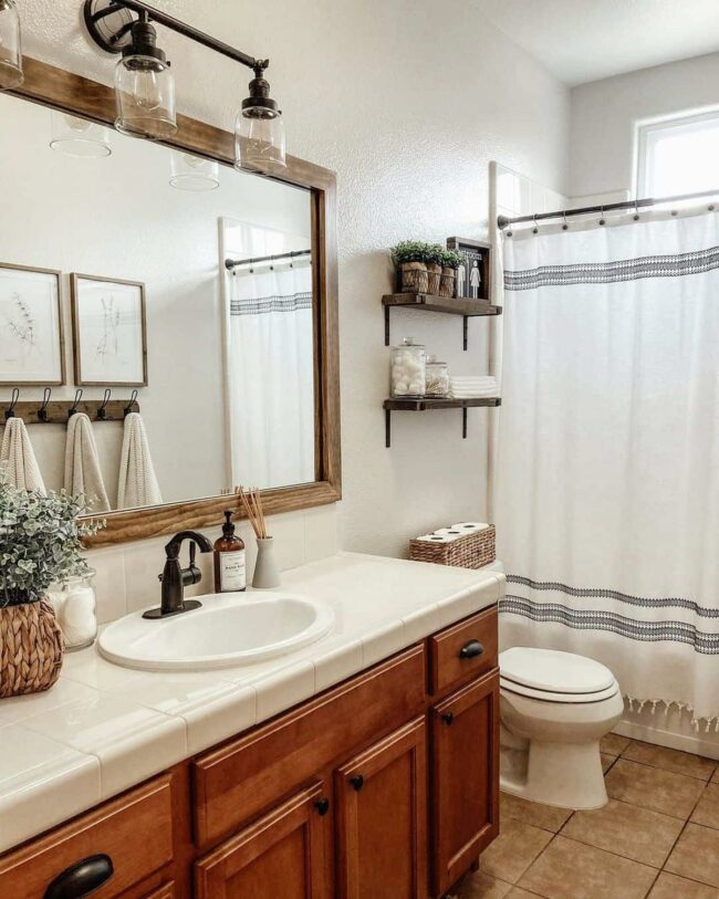 Farmhouse bathrooms radiate warmth through carefully curated design elements like beige tile flooring that welcomes you instantly.