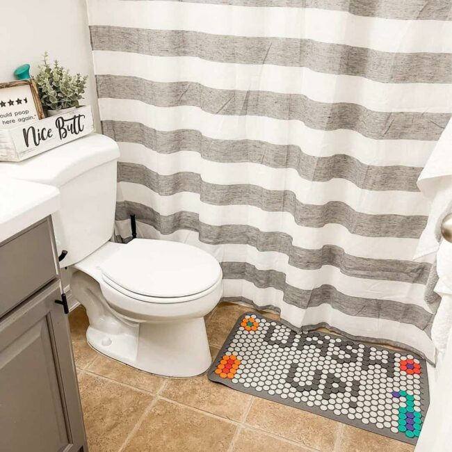 Striking gray and white striped shower curtains instantly elevate small bathroom designs by drawing eyes and creating visual drama.
