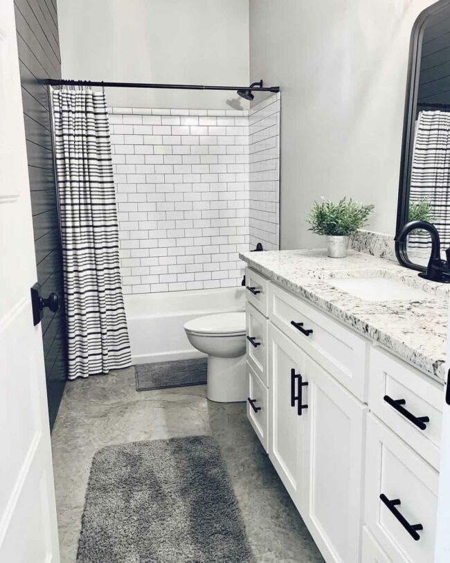 Black and white design makes this bathroom pop with personality, drawing you into its chic atmosphere.