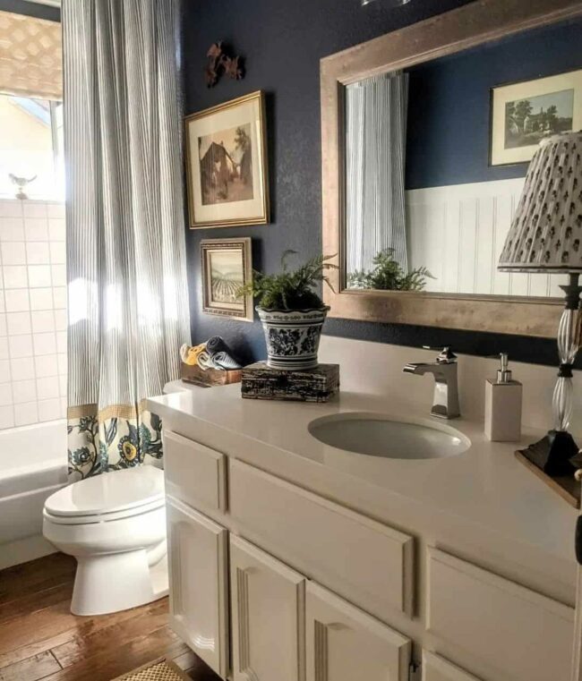 Dark blue accent walls instantly elevate bathroom charm with dramatic flair.