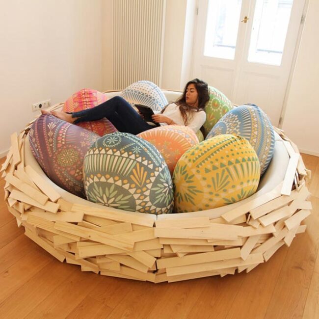Sculptural bird nest sofas redefine relaxation with their mesmerizing egg-like shape and wooden framework that hugs you like a protective cocoon.