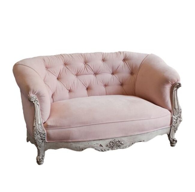 Pink fabric embraces you like a royal hug on this magnificent vintage sofa, creating an instant connection with its luxurious design.