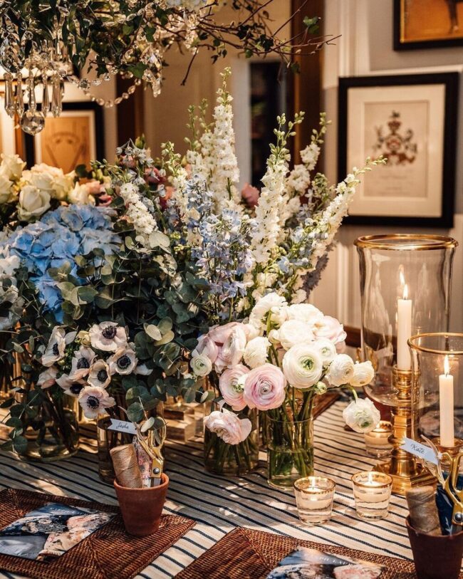 Carefully chosen flowers like hydrangeas, roses, and ranunculus provide depth and texture without overwhelming the scene.