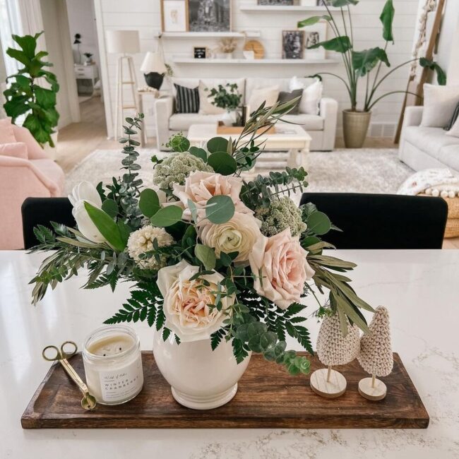 Living rooms benefit most from statement centerpieces featuring seasonal tulips or peonies in elegant ceramic vases.