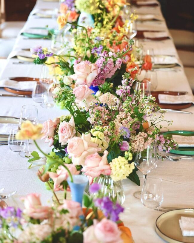 Greenery along runner edges adds essential depth and textural interest to the display.