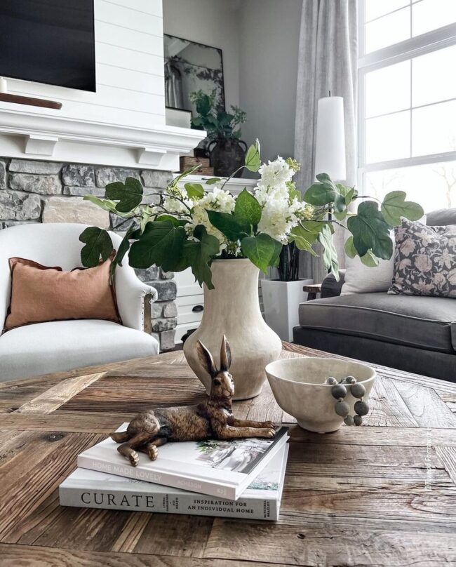 Greenery adds depth and dimension, creating a relaxed and organic display that feels effortlessly elegant.