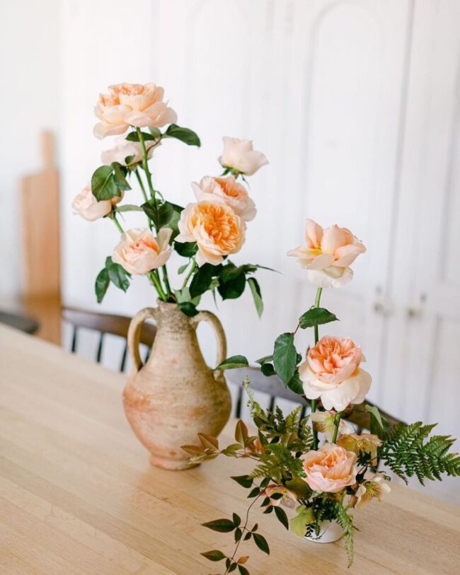 Minimal design principles work best, ensuring the peach roses remain the focal point of this elegant botanical display.