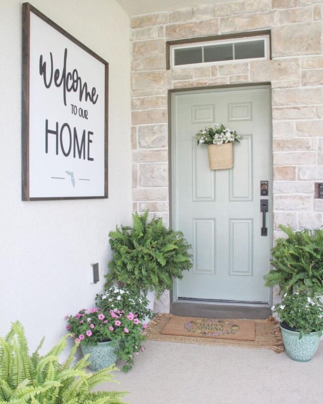 Personalized welcome signs elevate spring porch decor with charming character and immediate visual appeal.