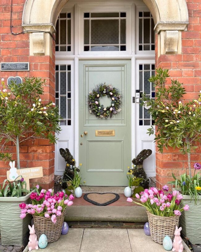 Hanging a carefully crafted wreath adorned with pastel ribbons and spring blossoms adds a touch of whimsy to your entryway.