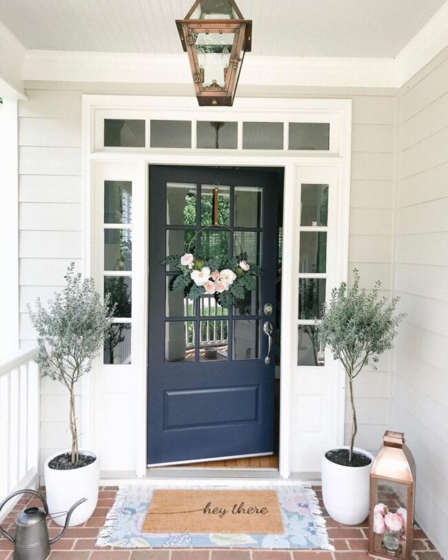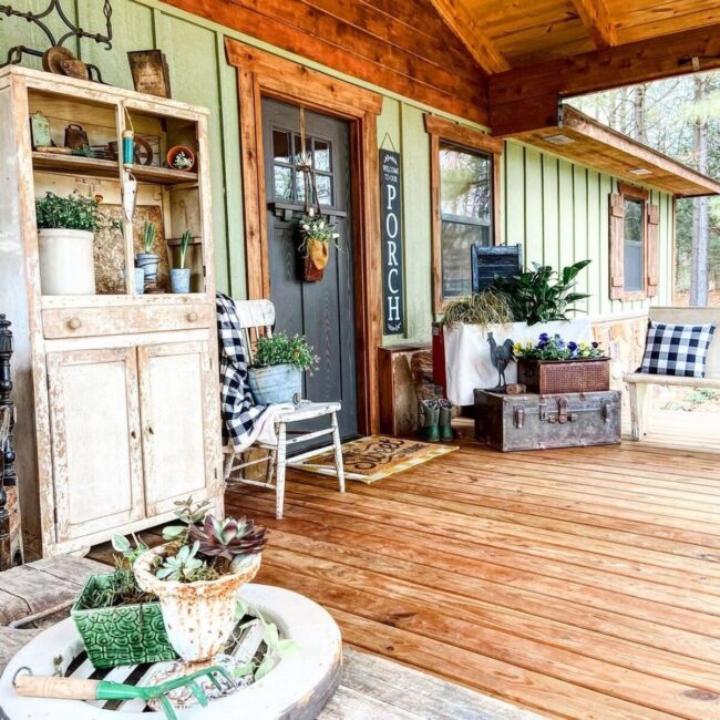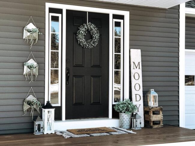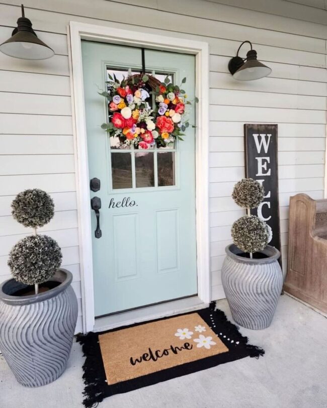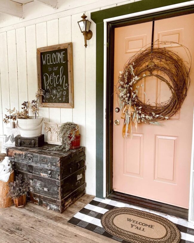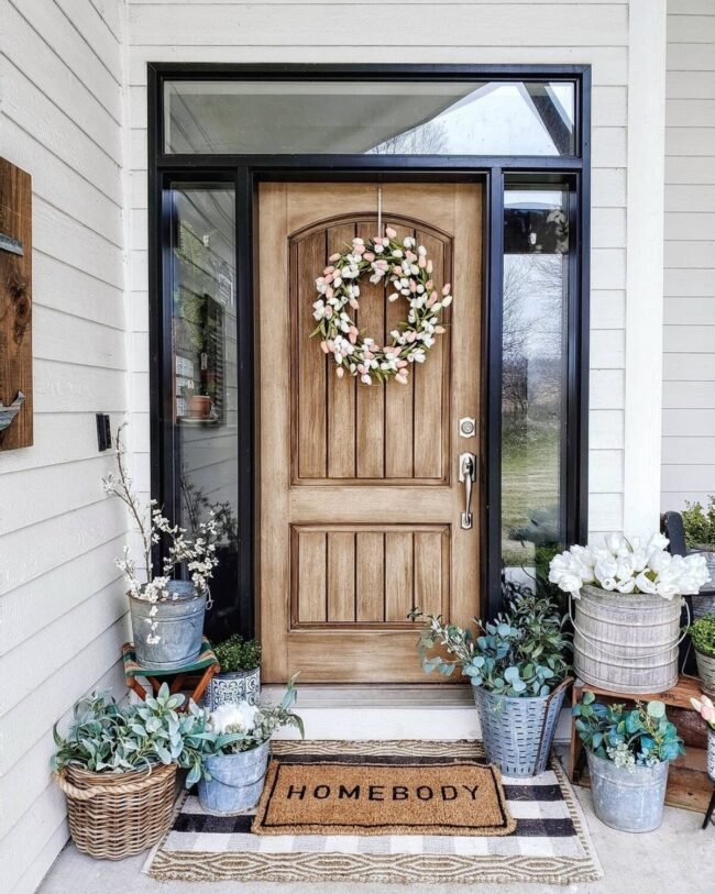 Wooden elements like vintage planters or distressed signs enhance the pastoral feel and draw attention to your carefully curated doorway.