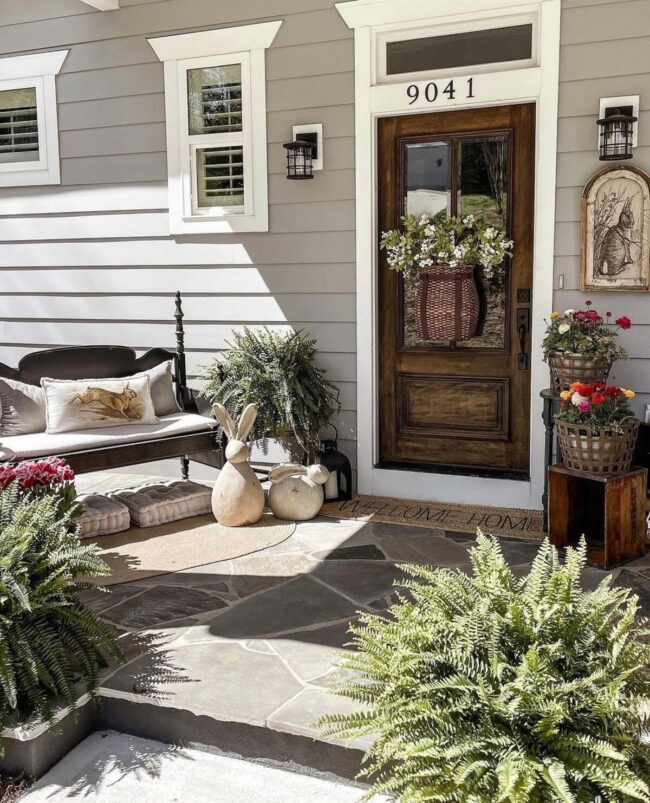 Spring porches bloom with bunny-themed charm when rustic elements and natural materials create an inviting outdoor sanctuary.