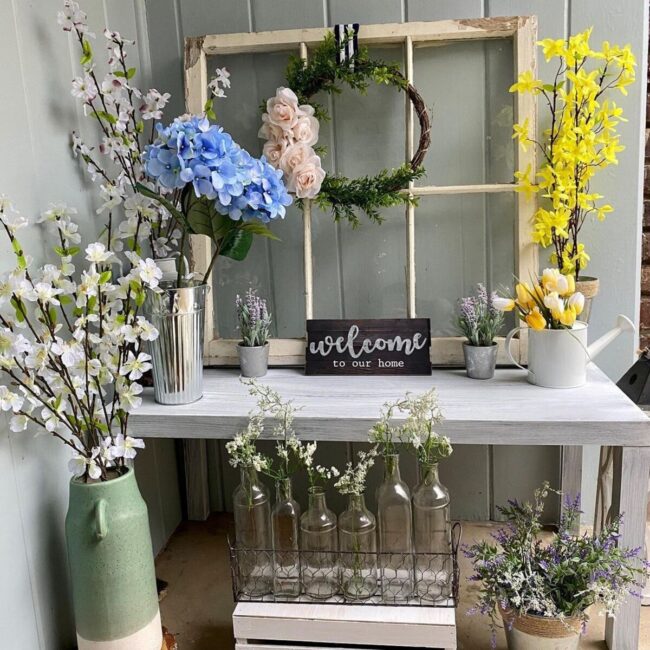 Woven baskets overflowing with pastel silk flowers or fresh blooming branches enhance the welcoming atmosphere.
