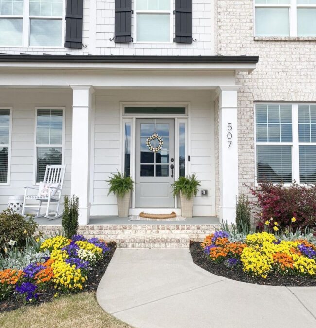 Cheerful spring blooms like tulips, daffodils, and pansies burst with color, drawing eyes from the street toward your welcoming doorway.