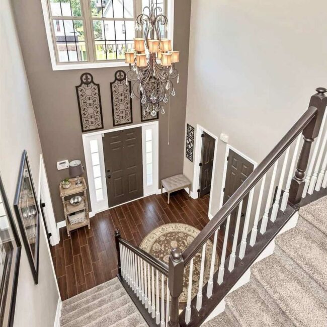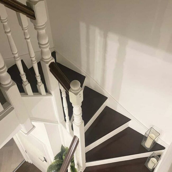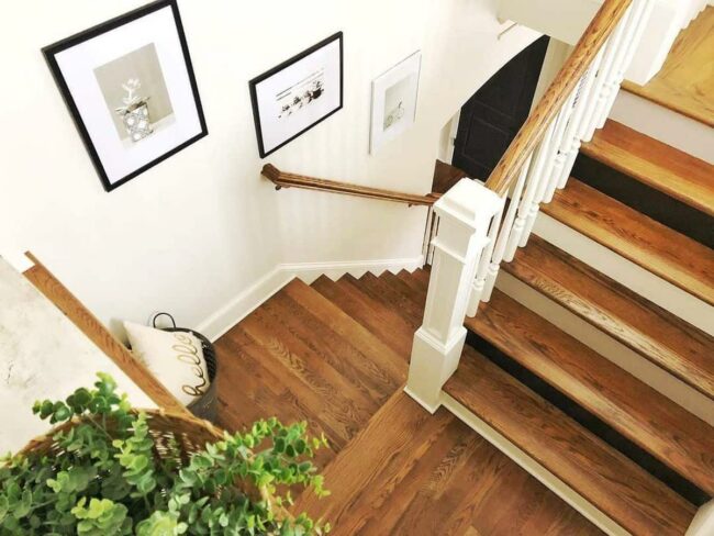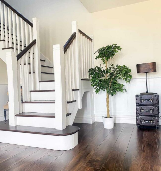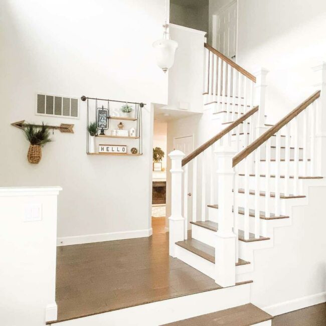 Staircase spindles in crisp white dance alongside a rich wood handrail, creating an instant visual drama that catches your gaze.