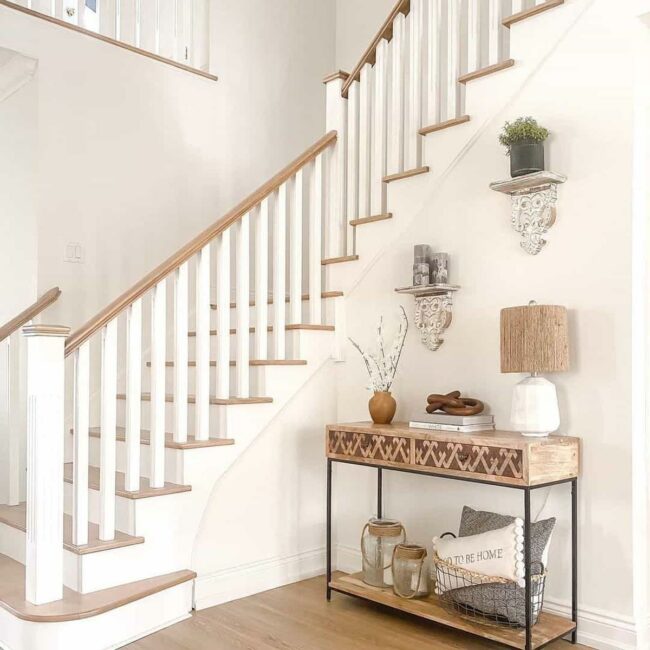 An artfully crafted two-toned entry table anchors the scene, inviting subtle pause and appreciation.