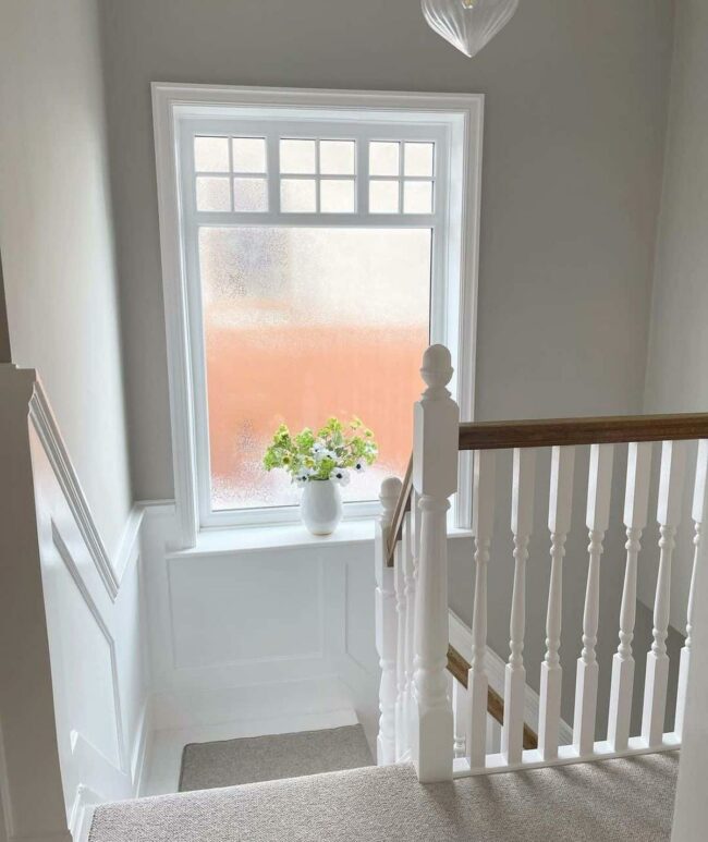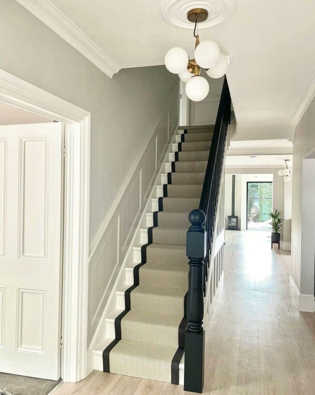 Soft grey walls adorned with elegant wainscoting set a serene stage for home comfort, while a light grey carpet cascading down the staircase whispers sophistication beside a pristine white banister.