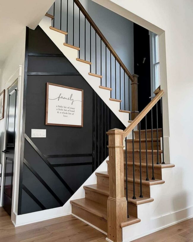 Modern wood stairs capture attention with dramatic black and white risers that create bold visual interest.