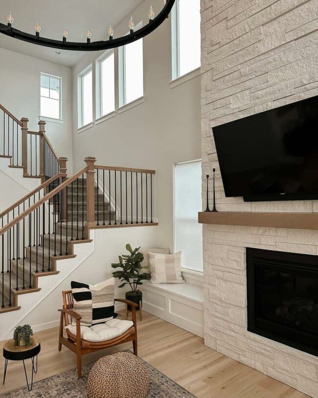 Tan stone surrounding the fireplace creates an elegant backdrop that captures your gaze instantly.