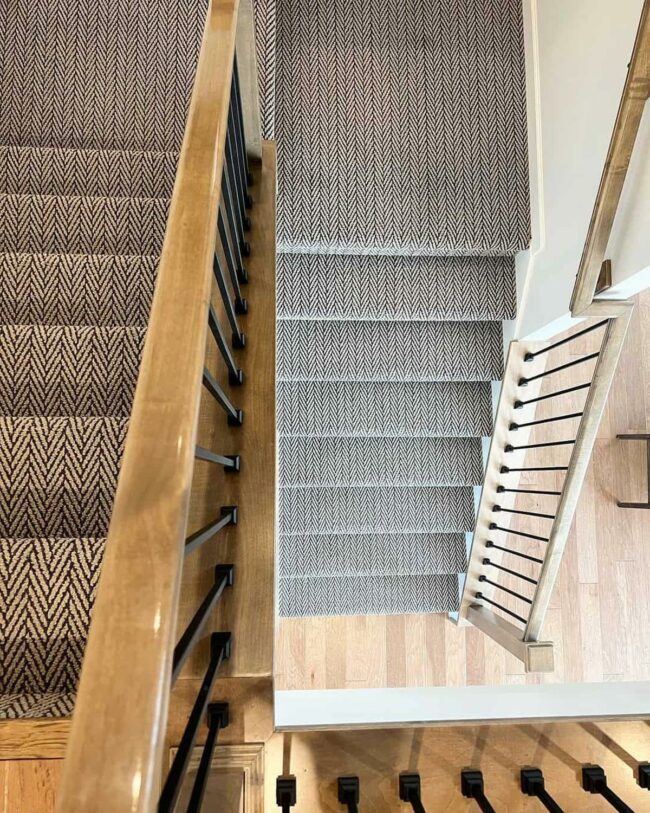 Switchback staircase design captures attention with its elegant herringbone carpet in beige and gray tones.
