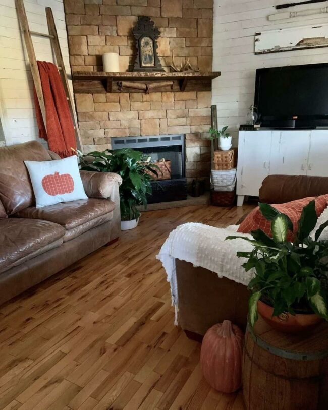 Wooden details like the stained mantel bring warmth and rustic charm to the space.