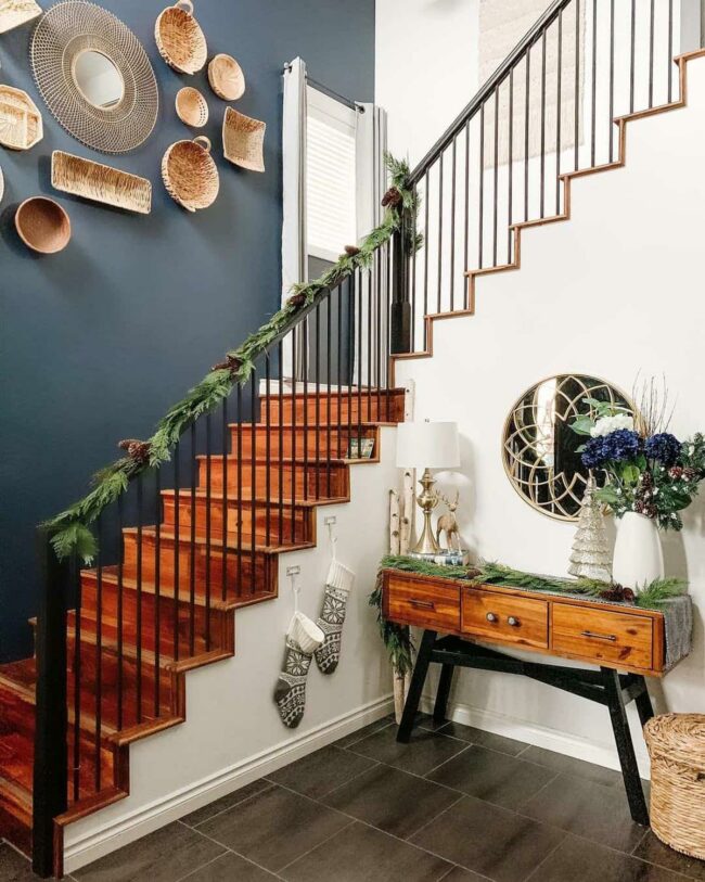 Pine garland gracefully drapes along the handrail, introducing a festive spirit that instantly captures attention.