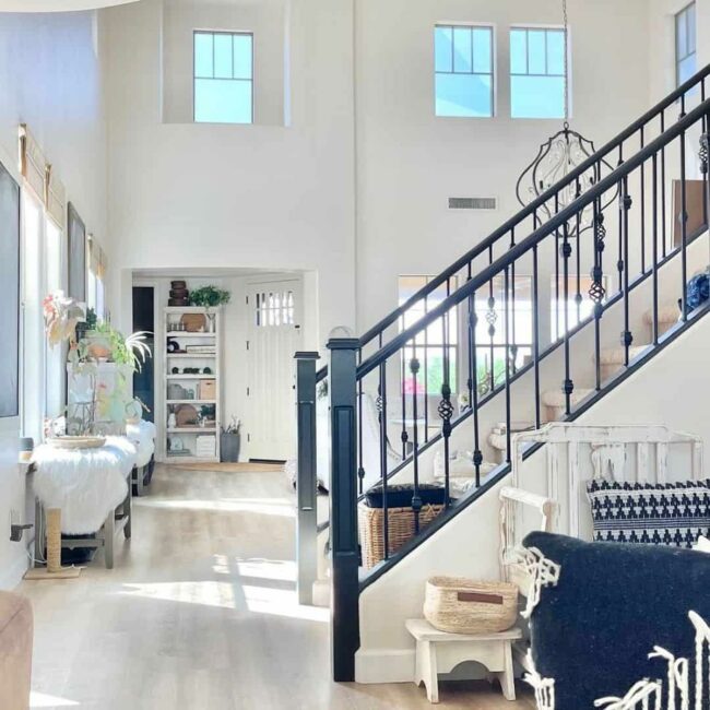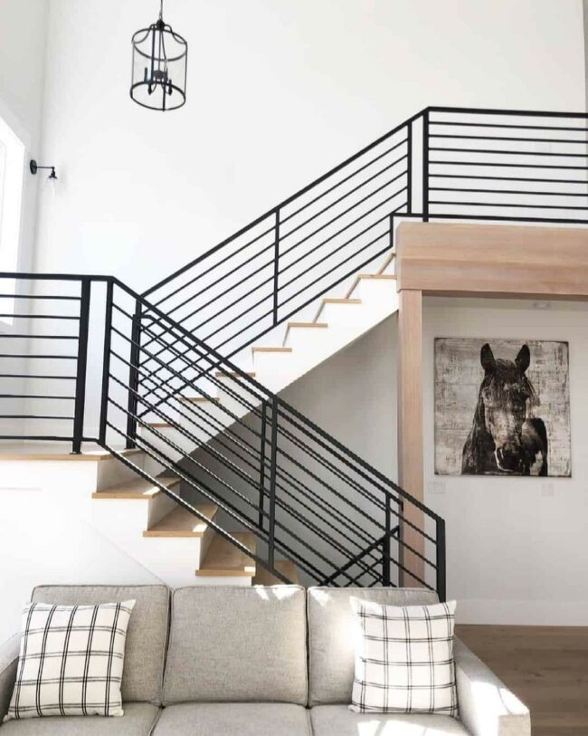 Black spindles contrast beautifully against neutral tones, making the stairway a dramatic focal point.