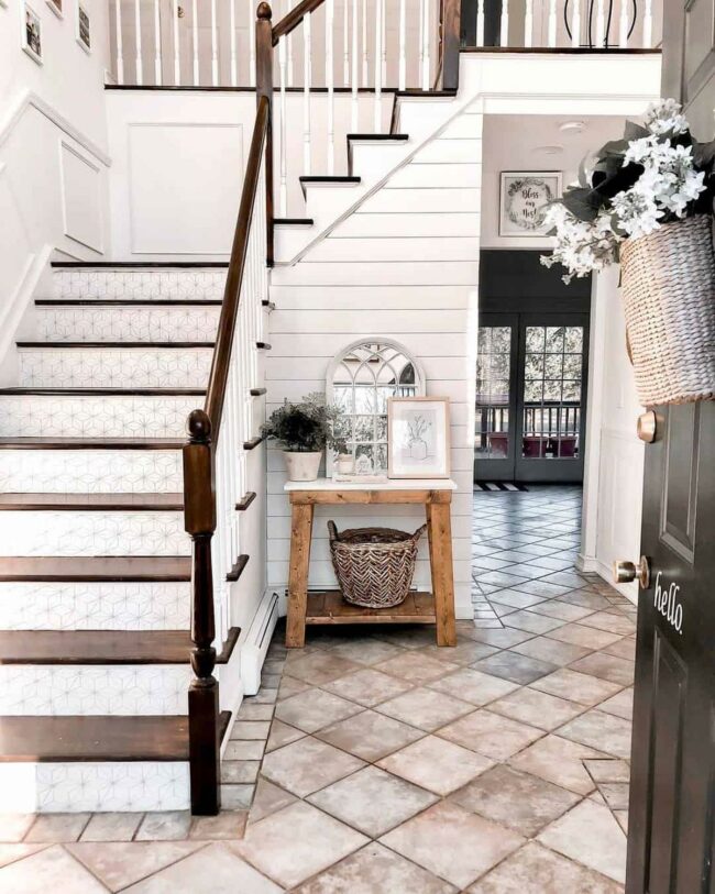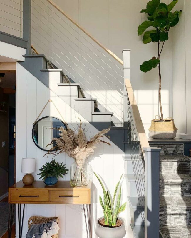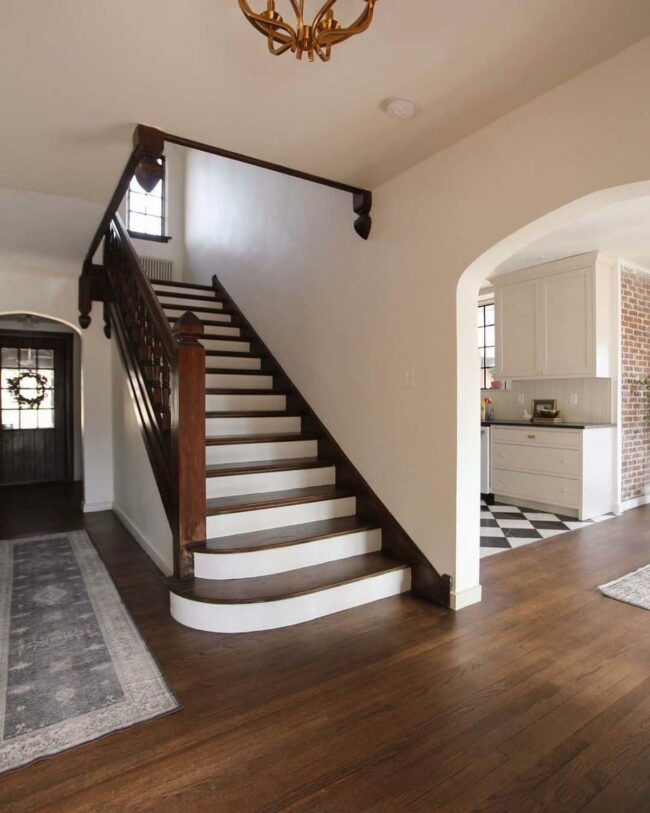 Wooden stairs with white risers instantly grab attention in any home, creating a dramatic visual statement that feels both modern and welcoming.