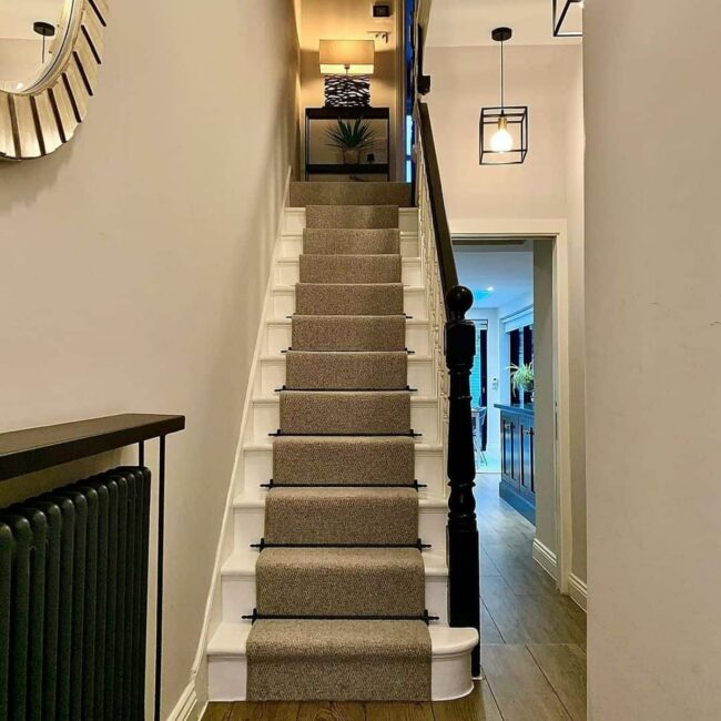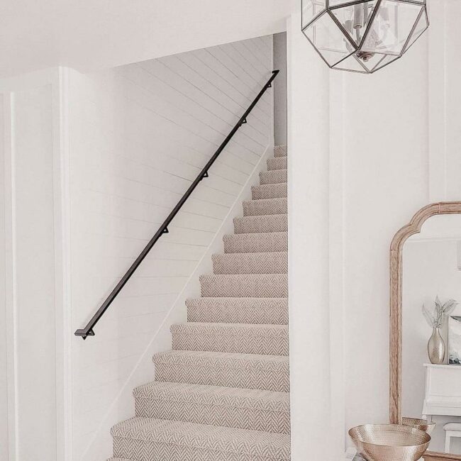 Black handrails slice through the design with modern sophistication, contrasting beautifully against soft beige herringbone carpet.