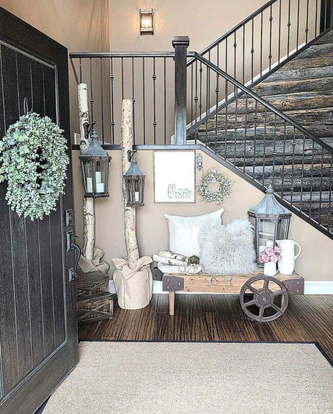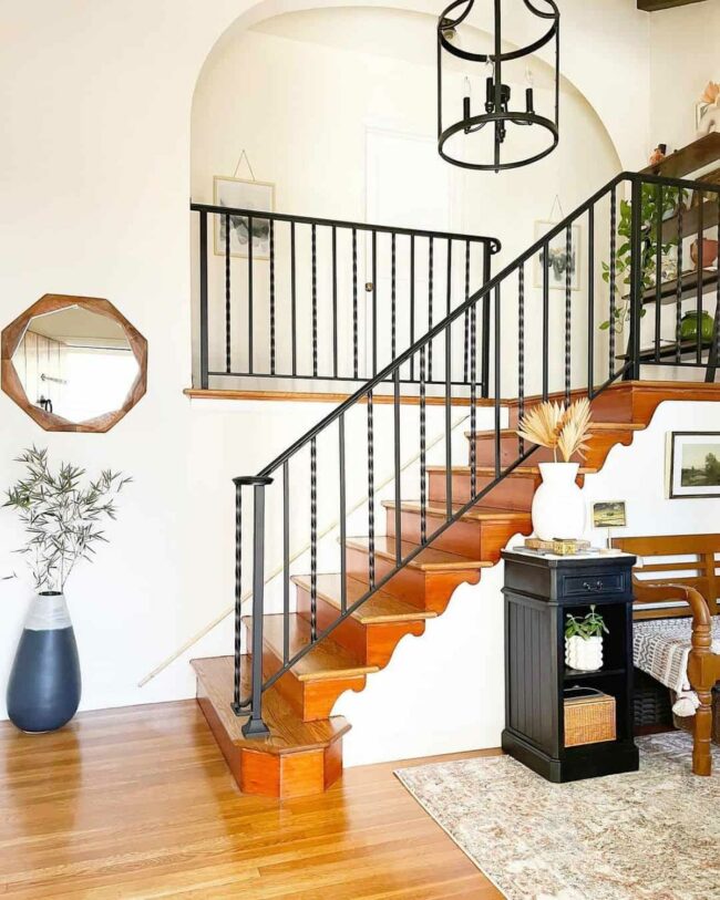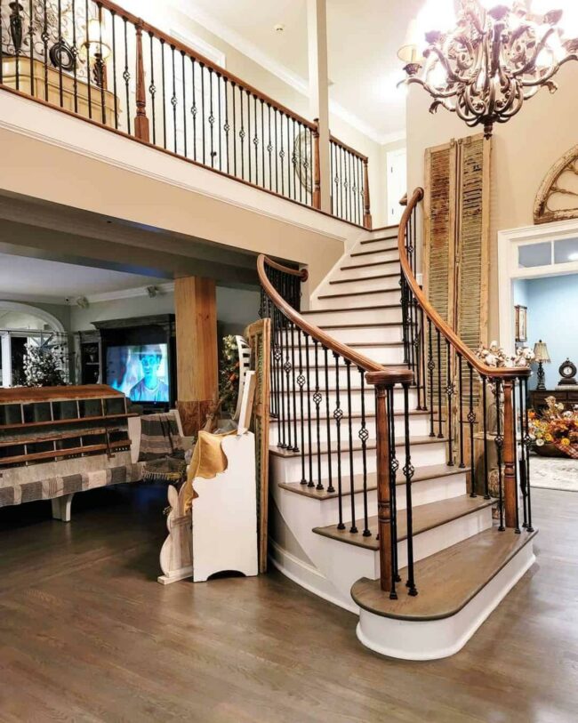 Rustic stairs dominate the space with bold black wood and elegant wrought iron spindles that draw your eye instantly.