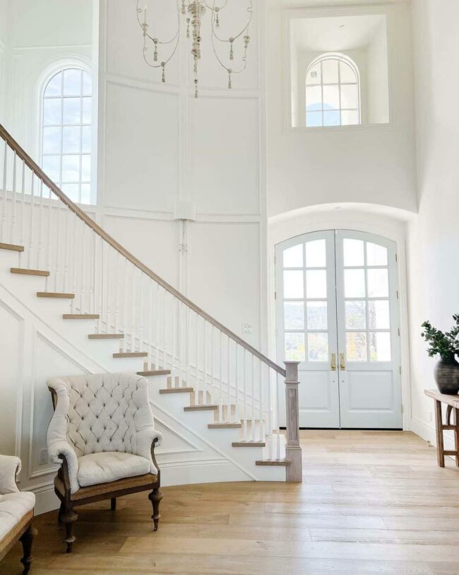 Delicate paneling adorns the staircase sides, adding subtle texture and refined sophistication.