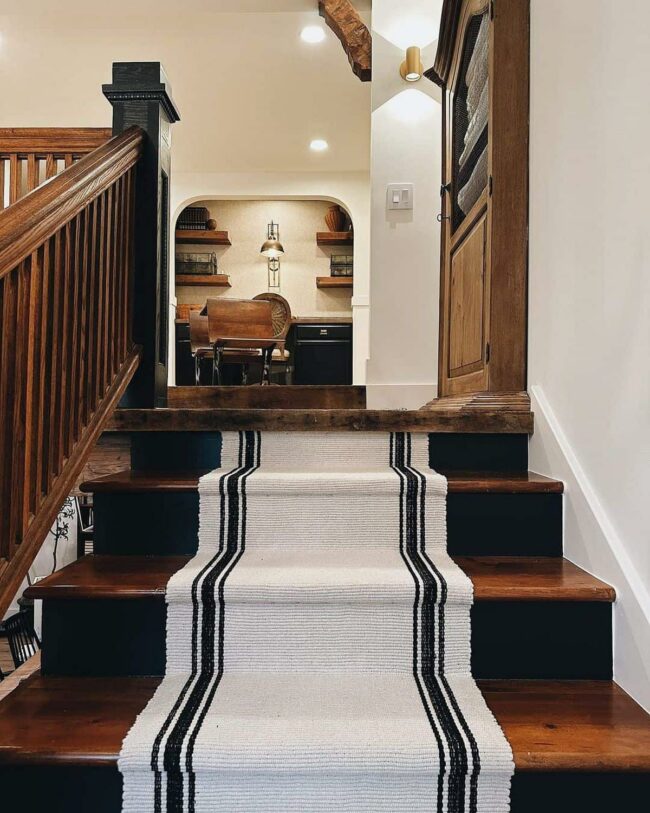 Clean white and black runners enhance safety while adding visual intrigue to the staircase.