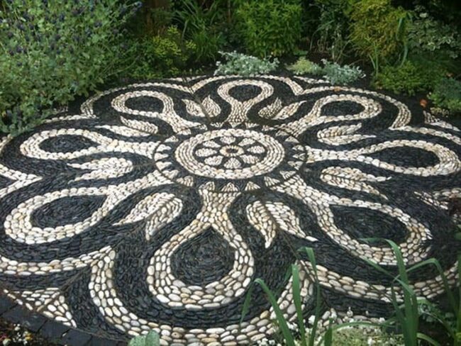 Dark and light stones weave intricate patterns across garden walkways, inviting exploration and visual delight.