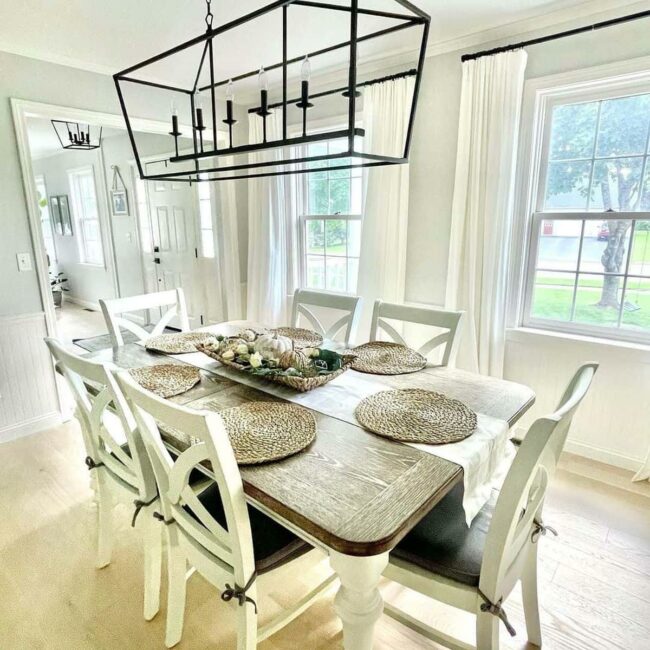 Farmhouse dining spaces radiate warmth with charming two-tone tables featuring white legs and rich wooden tops that instantly grab attention.