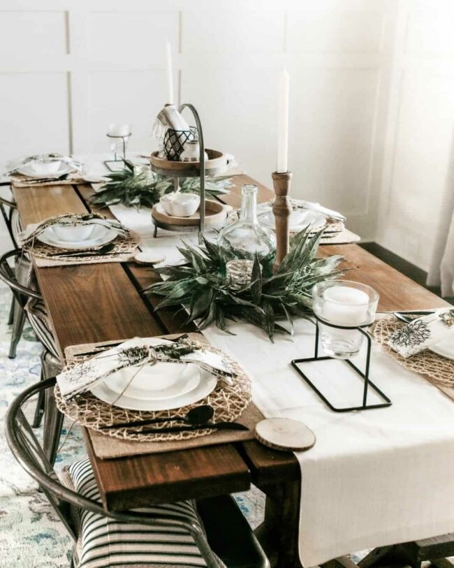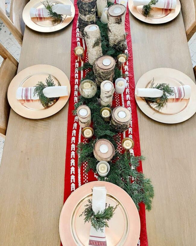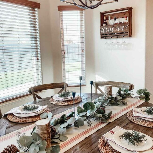 Pine branches spread a warm embrace across the dining surface, instantly transforming the space into a welcoming sanctuary.
