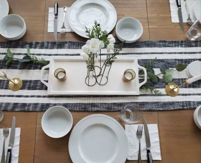 Gray and white striped runners draw the eye along the table's length, adding subtle visual interest.