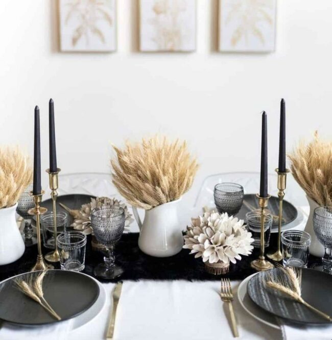Black and white napkins add dramatic contrast, creating visual intrigue.