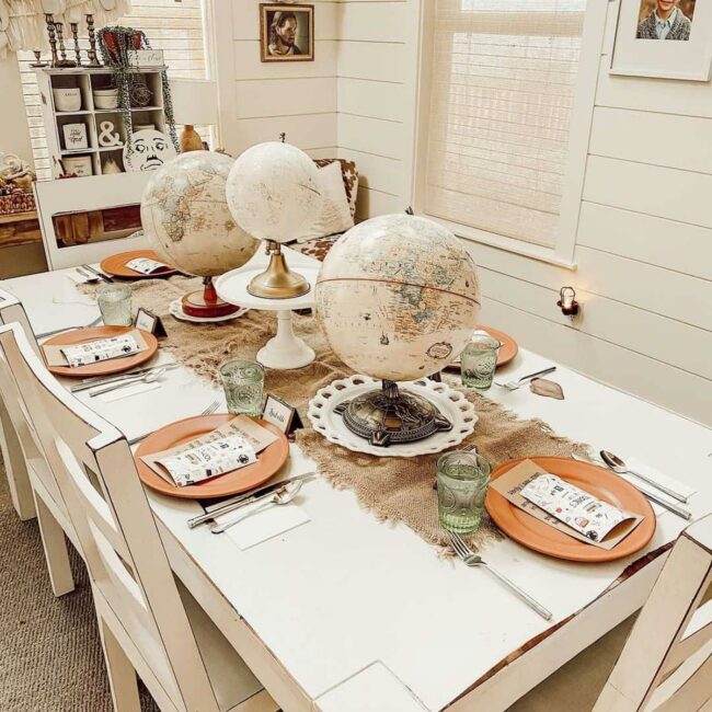 Global decor elements capture attention immediately on this farmhouse dining table, where three miniature spheres invite wanderlust discussions about far-off destinations.