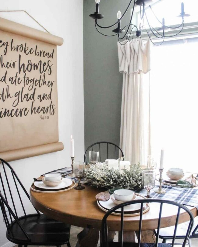 Sage green accent walls and flowing white drapes set a welcoming tone in this dining room where style meets comfort.