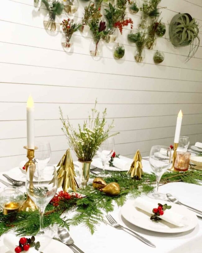 Holiday decor gets a magical upgrade with eye-catching abstract trees nestled among lush greenery, creating an artistic tablescape that instantly draws attention.