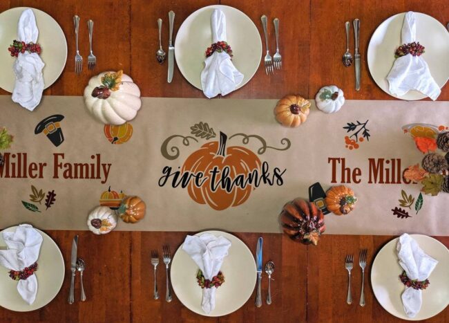 Personalized Thanksgiving table runners capture holiday magic with charming designs featuring pumpkins, autumn leaves, and pilgrim hats that immediately draw everyone's attention.
