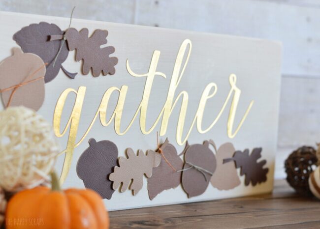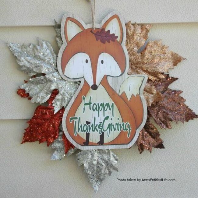 Bring woodland magic to your Thanksgiving decor with a whimsical red fox sign that sparkles with glittery leaves.