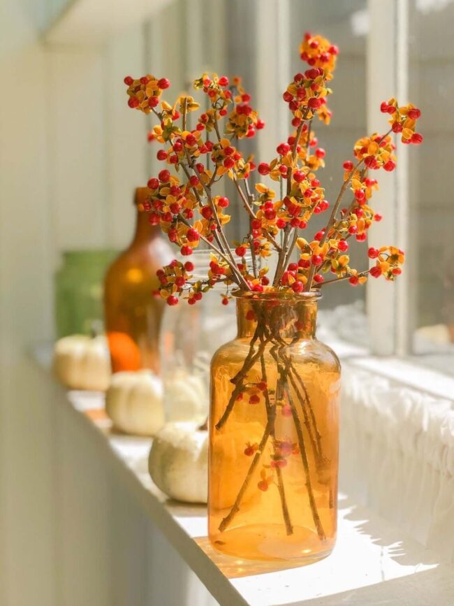 Bittersweet branches nestled in amber glass vases capture autumn's soul with deep red-orange tones that radiate warmth and natural elegance.