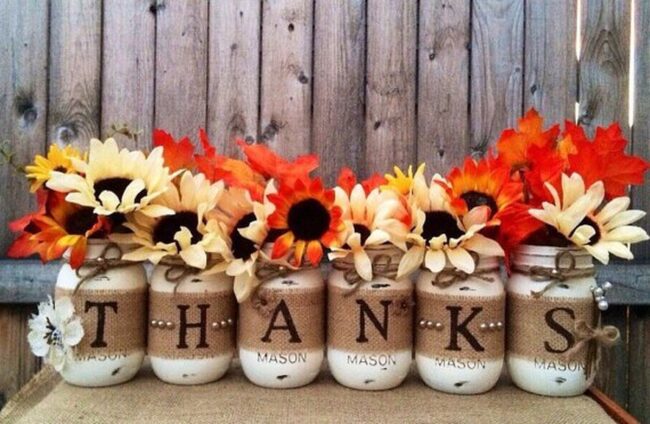 Mason jars burst with seasonal charm when adorned with heartwarming messages like "Thankful" and "Grateful" alongside beautiful autumn blooms.