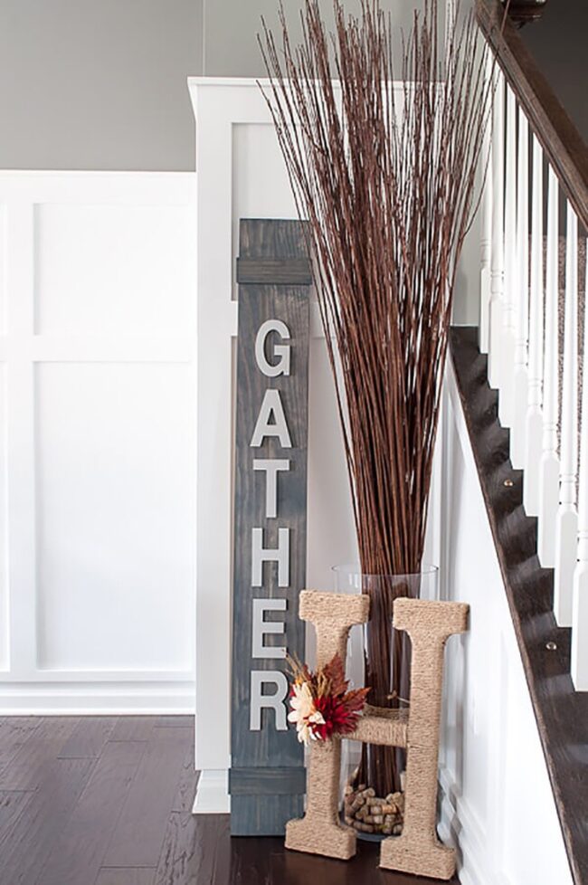 Rustic charm meets modern design through an elegant "Gather" sign crafted with delicate script, perfectly complementing a twine-wrapped family initial.