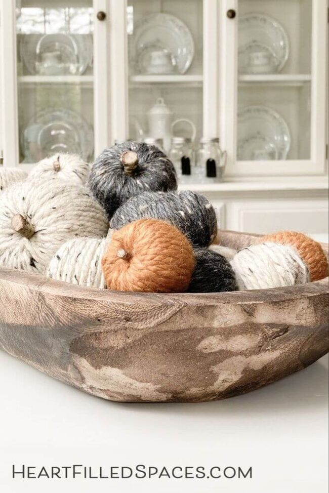 Wooden bowls brimming with handcrafted yarn pumpkins offer an irresistible autumn accent that instantly elevates home decor.