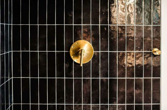 Black vertical tiles dominate this shower's dramatic design, creating an instant wow factor with their bold presence.